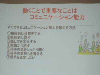 これからの自分自身のキャリアプランを考え、働くことに必要な力の一つにコミュニケーション力があることを教えていただきました。また、コミュニケーション力の鍛え方も教えていただき、みんな真剣に学んでいました花丸