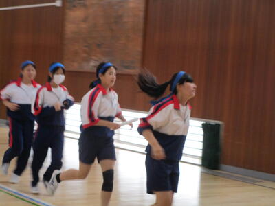 午前中は雨が降っていたので、体育の授業は体育館でバトンパス練習を行っていました体育祭に向けて、着々と練習しています