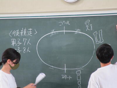 朝は実行委員が練習予定を立てて打合せ、種目の練習中は、みんなで知恵を出し合って作戦を練っています。だんだんチームワークが高まってきました
