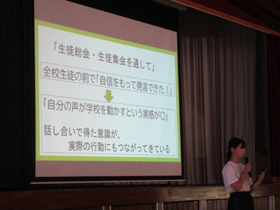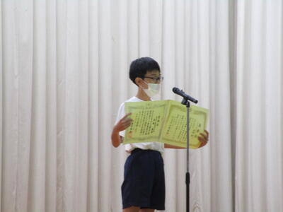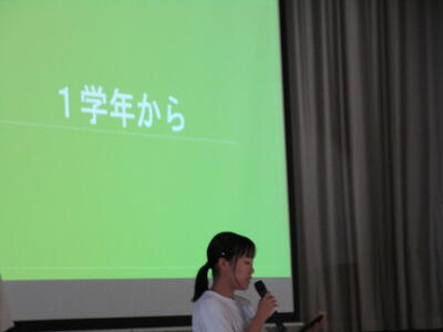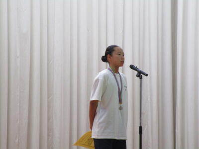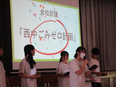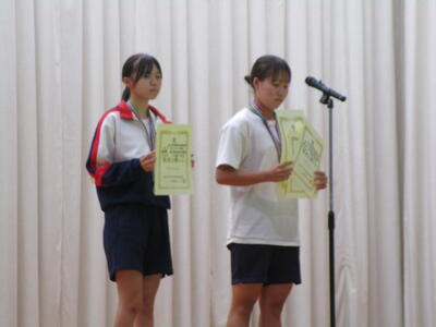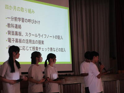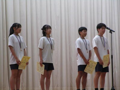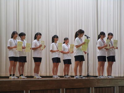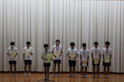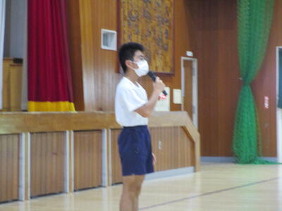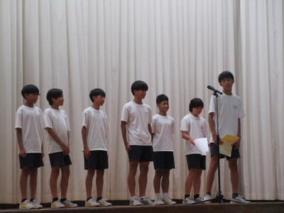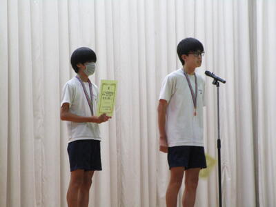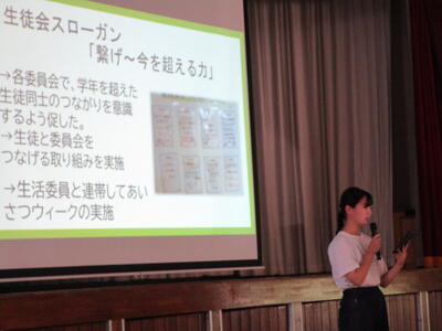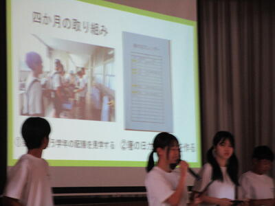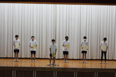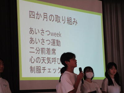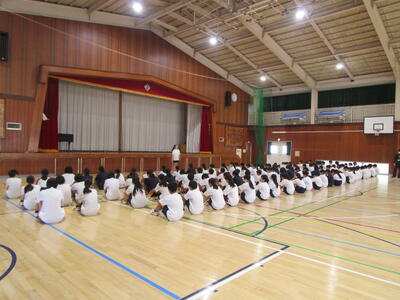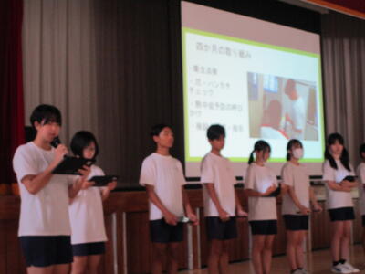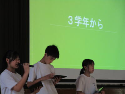 ①各部活動や大会などの表彰報告 ②学年、委員会、生徒会から活動報告 ③夏休みを迎えるにあたって、校長と生徒指導主任の話