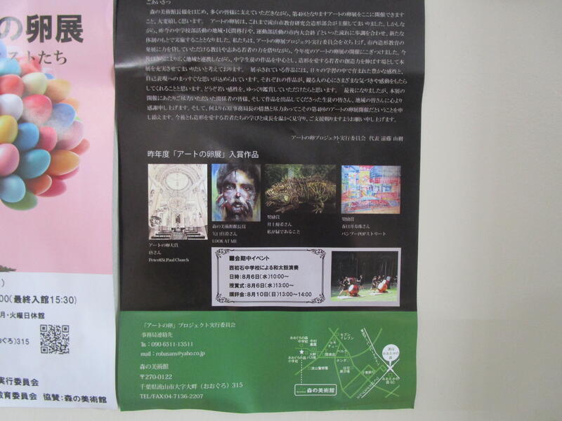 8月6日(水)~8月31日(金) 流山市大畔にある「森の美術館」にて、市内中学生の美術作品展「第4回アートの卵展」が開催されます ※月曜・火曜 休館 ※8/11~8/16 夏季休館