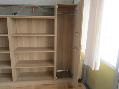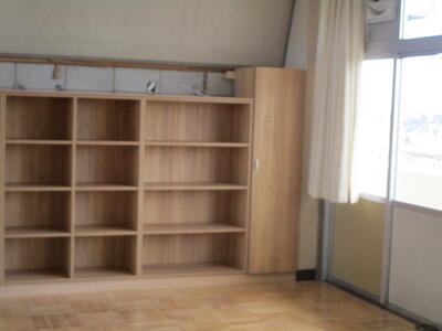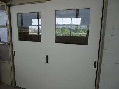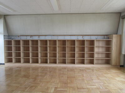 教室内の生徒用ロッカーが設置され、床が磨かれ、入り口ドアが新しくなっています