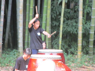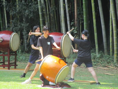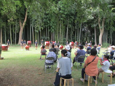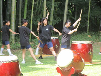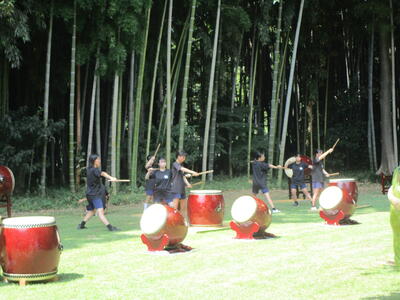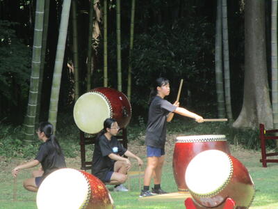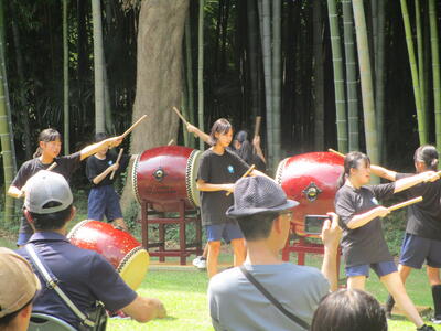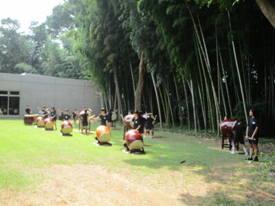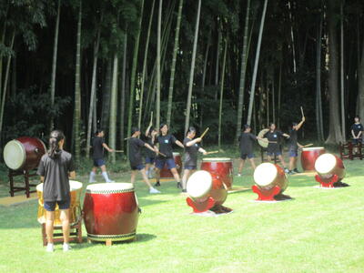 森の美術館で開催の「アートの卵展」オープニングイベントとして、総合文化部の和太鼓演奏を披露しました