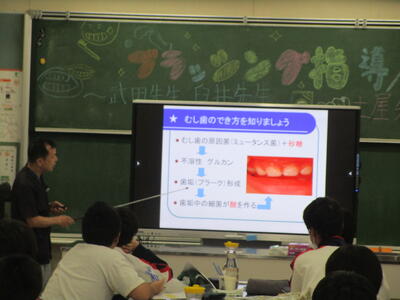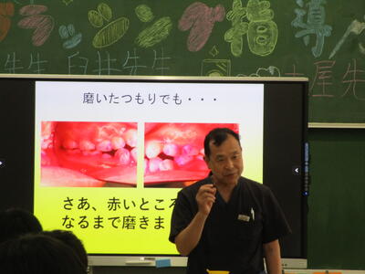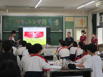 10月16日(木) 本校の学校歯科医であるファミリー歯科医院の武田先生と、歯科衛生士の臼井先生、土屋先生にお越しいただき、2年生を対象にブラッシング指導をしていただきました。