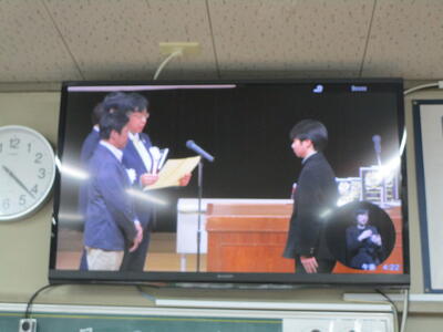 この大会はYouTubeでライブ配信されており、校内では、3年生全員が各教室で発表を見守り、終了後は大きな拍手が沸き起こりました