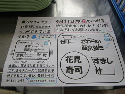 今日のメニューは入学のお祝いと春を感じる「花見寿司」「さわらの西京焼き」「すまし汁」「ゼリー」でした1年生も初めての配膳ながら、テキパキと準備をして、みんなで楽しくいただきました