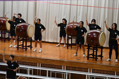 毎年指導していただいており、和太鼓のオリジナル曲も作っていただいています。今日は、その曲も含め文化祭「潮祭」で演奏する曲を稽古していただきました。練習の成果は、10/31(金)に行われる「潮祭」で披露します。お楽しみに