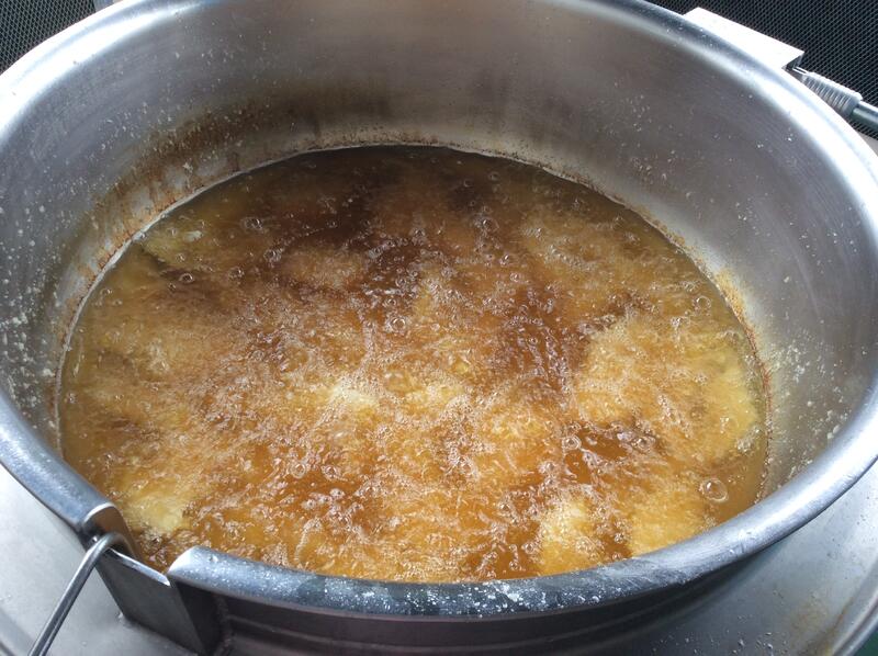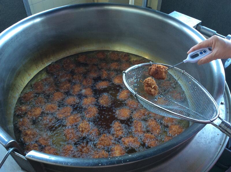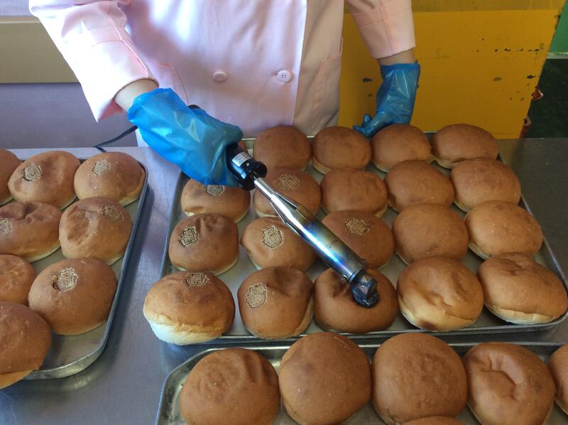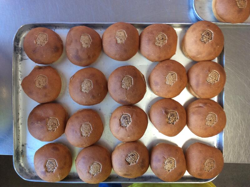 今日のチキンカツバーガーは、サプライズでにしもりくんの焼き印をパンに焼きつけました