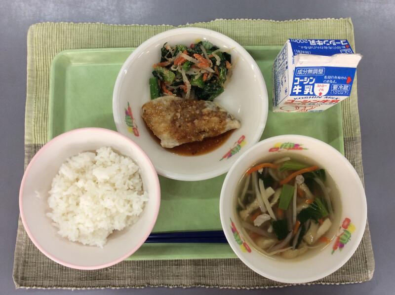 牛乳 ご飯 鱈のみりんマスタードソース 小松菜の胡麻和え 沢煮椀