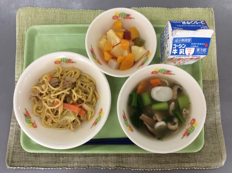 牛乳 豚キムチ焼きそば トックスープ フルーツカクテル