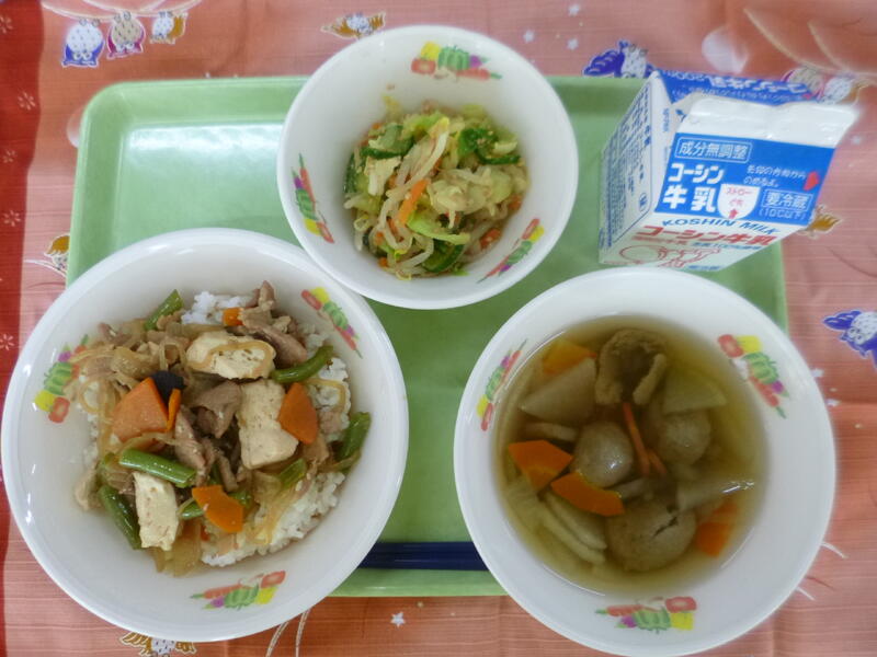 牛乳 すき焼き丼 ごま酢和え 鰯のつみれ汁