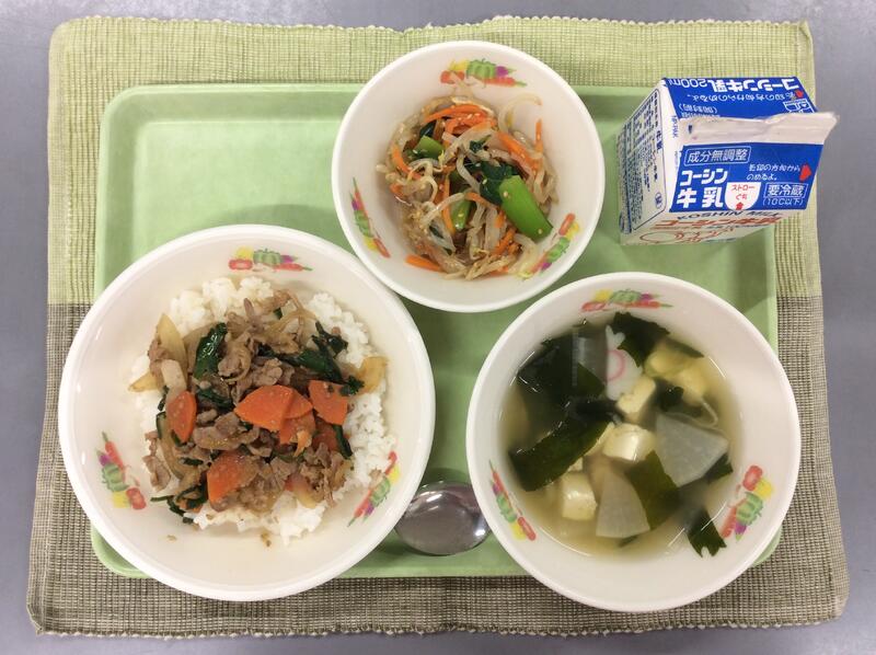 牛乳 プルコギ丼 もやしとあおなのナムル わかめスープ