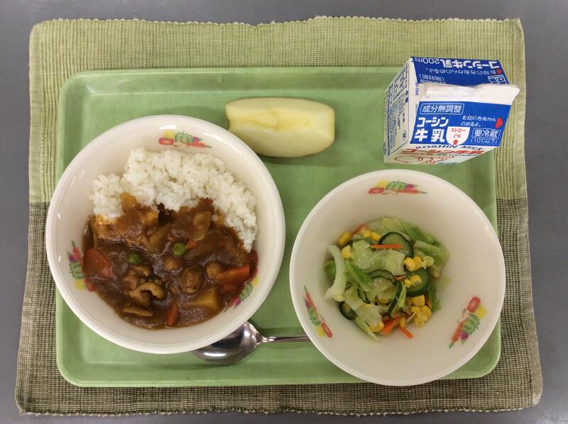 牛乳 ピヨピヨカレーライス レモンドレッシングサラダ りんご