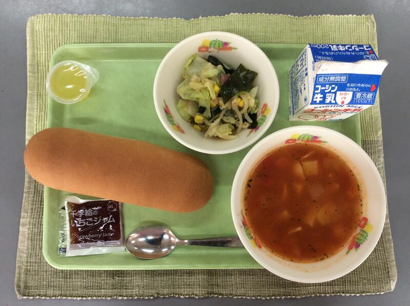 牛乳 コッペパン いちごジャム ミネストローネ 海藻サラダ ひとくちはちみつレモンゼリー