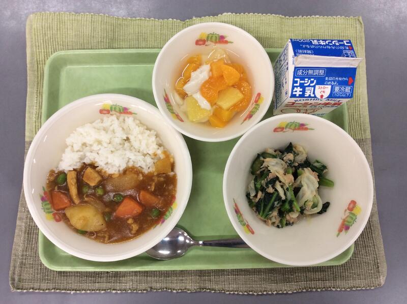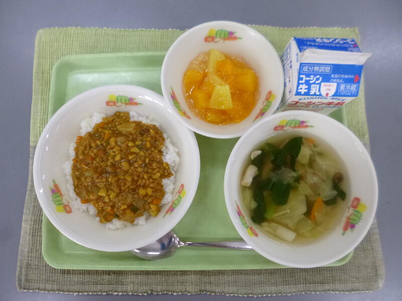 牛乳 ドライカレー 野菜ときのこのスープ フルーツのゼリー和え