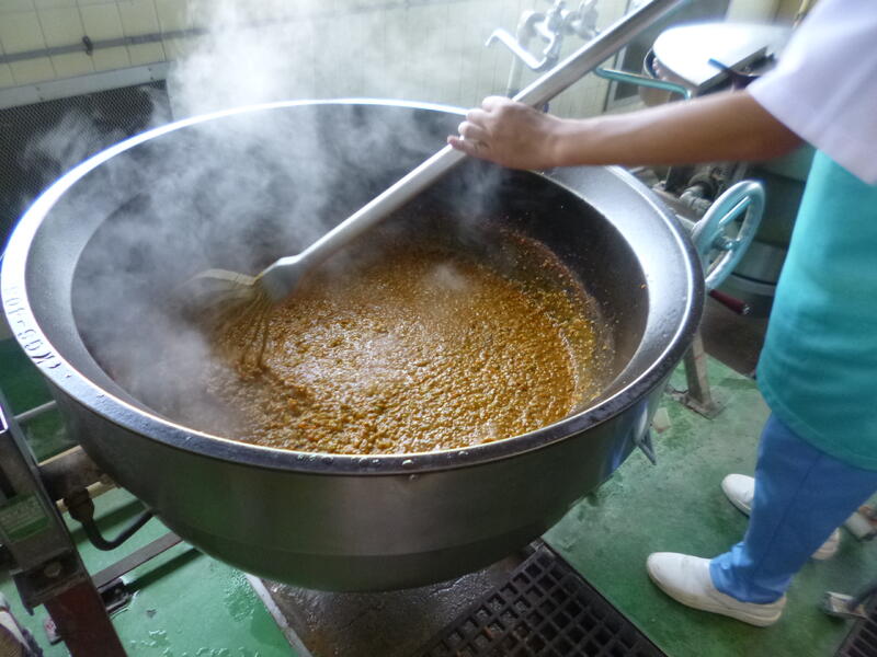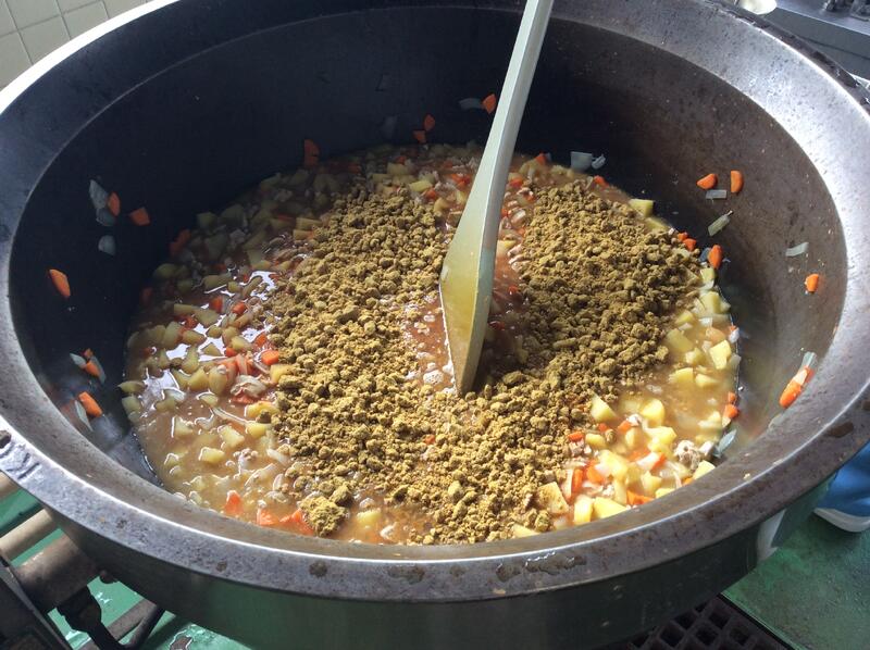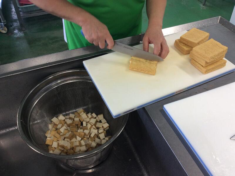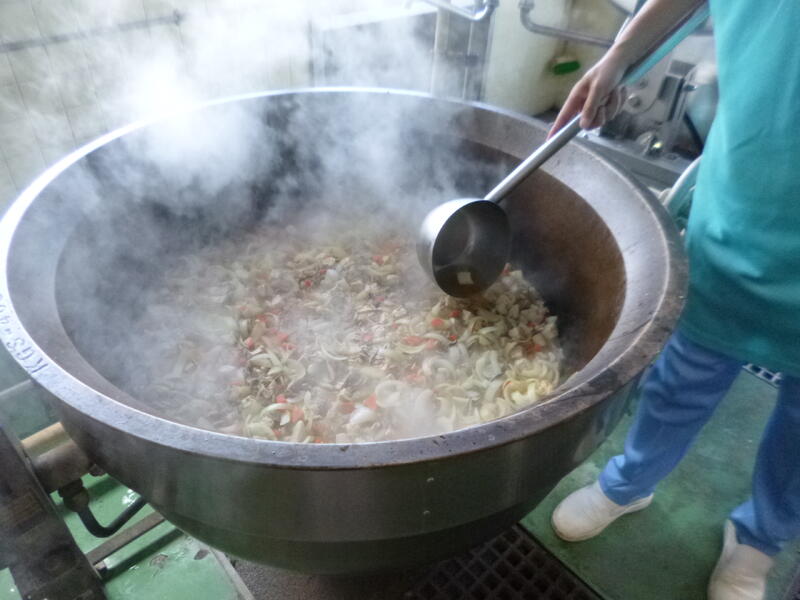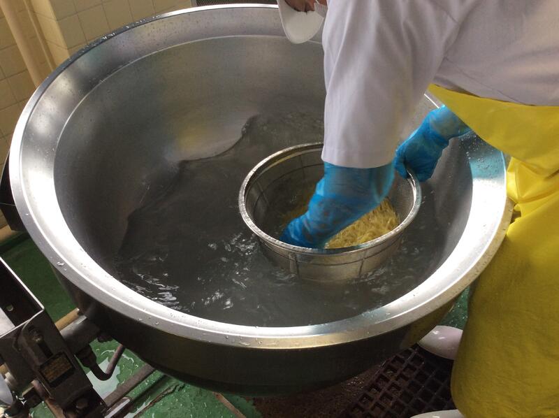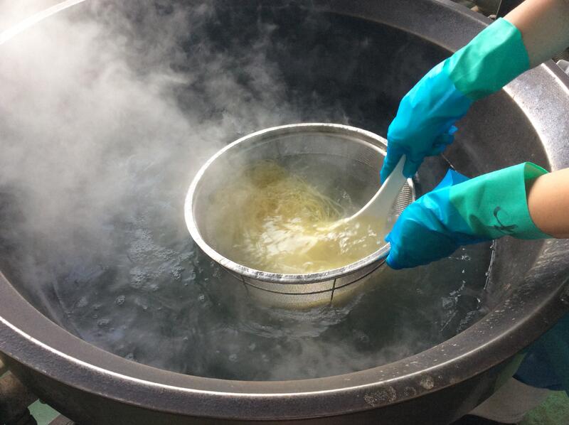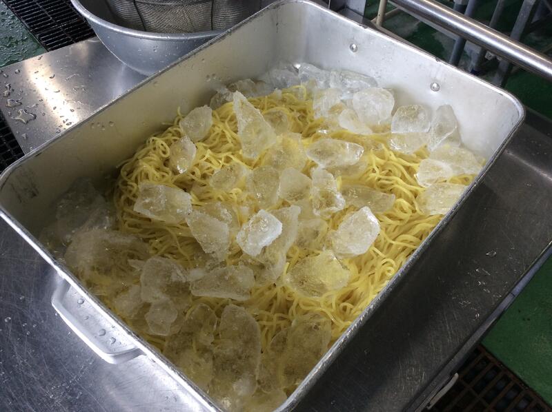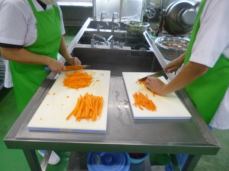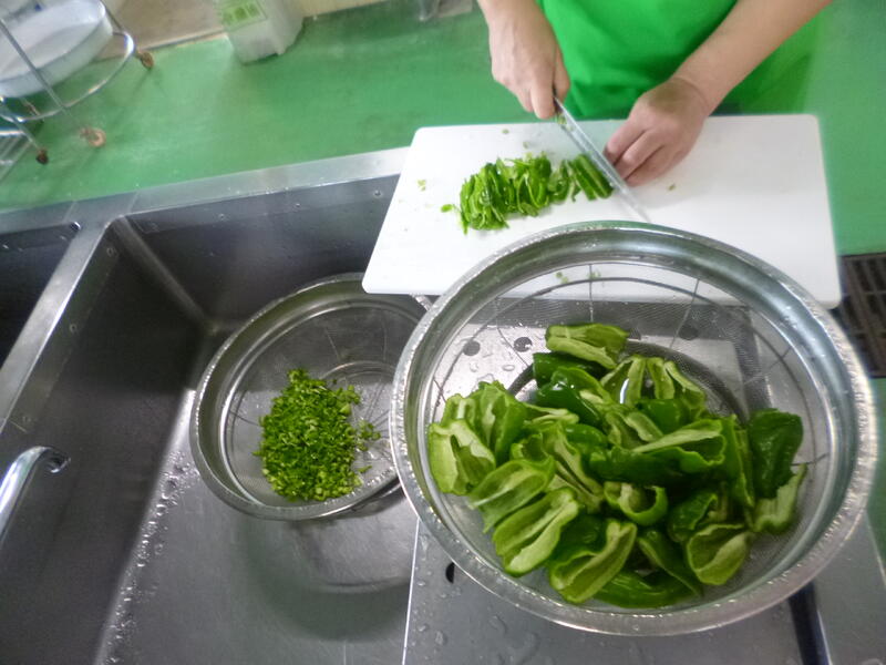 今日は、ジャージャー麵を作りました。冷凍の麺を茹でて、そのあとすぐに水冷して麺を冷やし、氷を乗せて配缶しました。子どもたちが残さずよく食べていました。