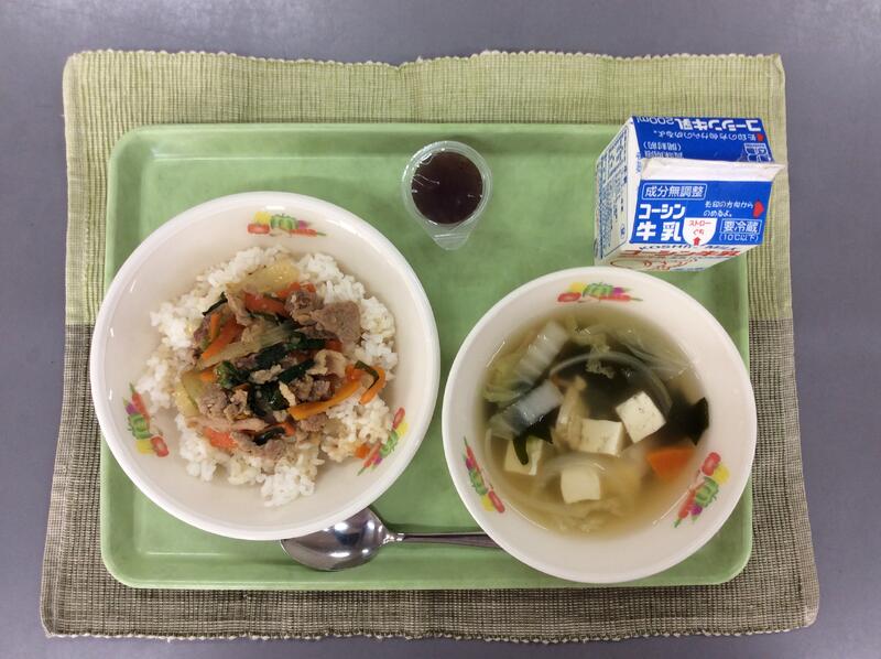 牛乳 プルコギ丼 豆腐のスープ ひとくちぶどうゼリー