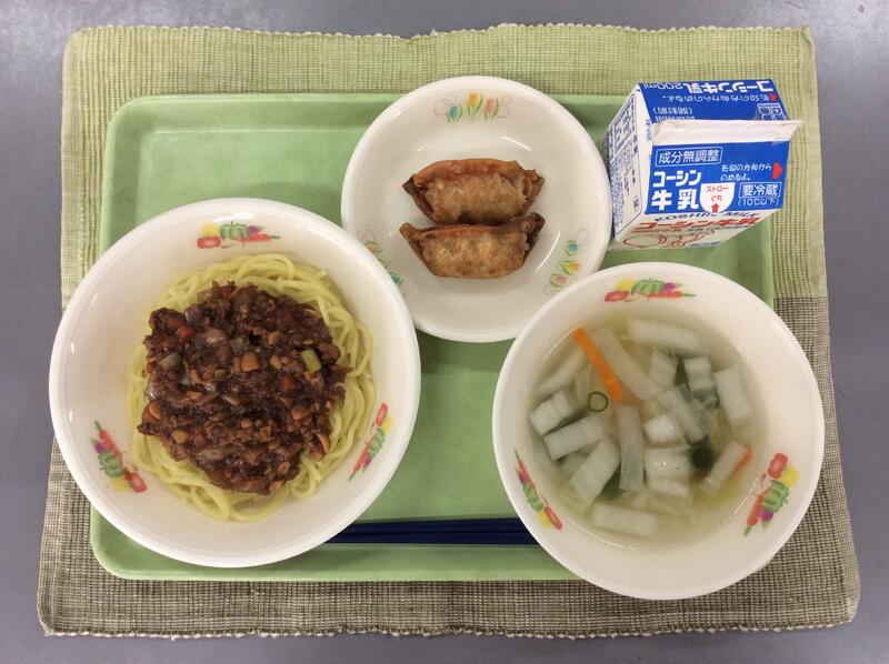 牛乳 ジャージャー麵 揚げ餃子 大根の中華スープ