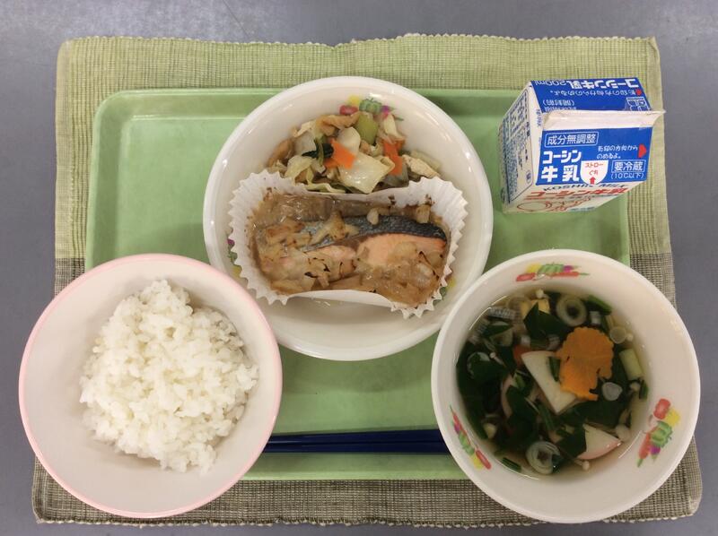 牛乳 ご飯 鮭の味噌マヨネーズ焼き 小松菜と油揚げの煮浸し にしもりくんのすまし汁