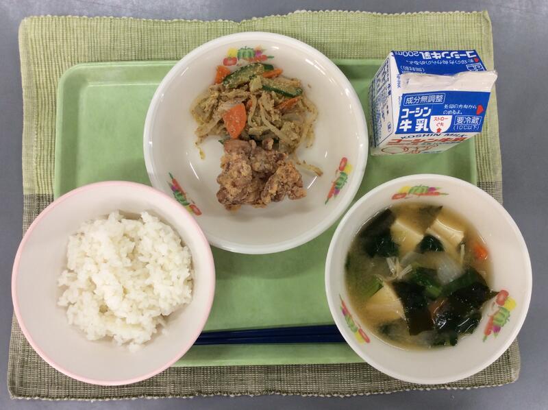牛乳 ご飯 鶏の唐揚げ ごま酢和え 厚揚げのみそ汁