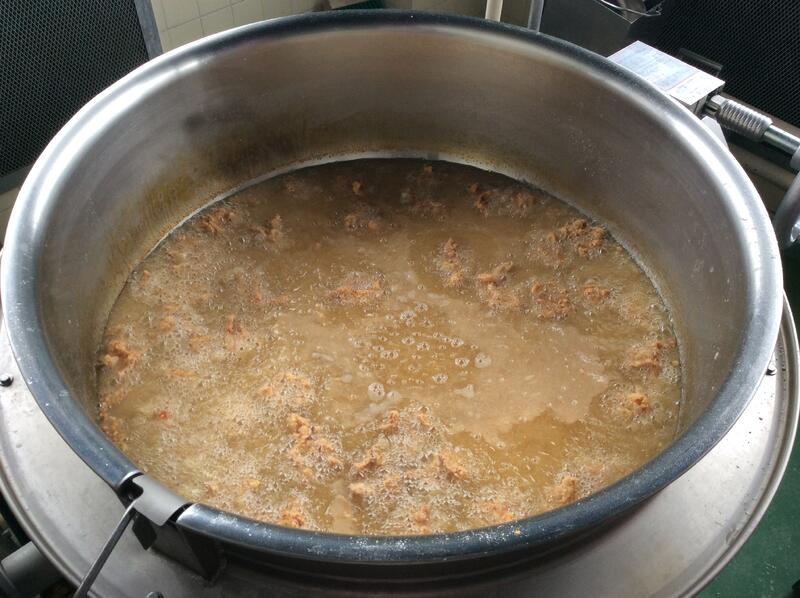 今日は、ミルキー揚げパンを作りました。給食室でコッペパンを揚げて、ひとつひとつ丁寧にスキムミルクと砂糖を混ぜた粉につけました。