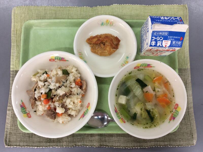 牛乳 豚肉と青ねぎのピラフ タンドリーチキン 白菜とベーコンのスープ