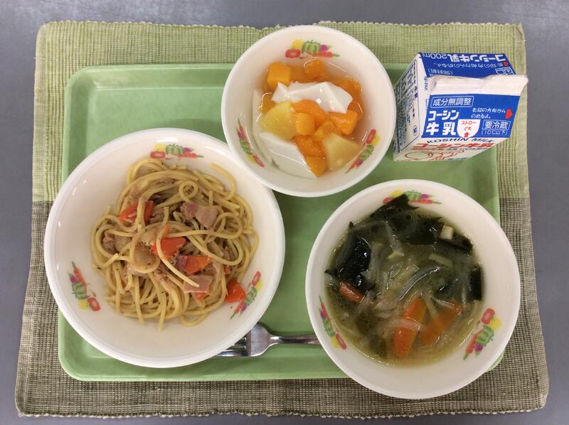 牛乳 ツナとベーコンのスパゲティ 切り干し大根の洋風スープ 豆乳杏仁豆腐