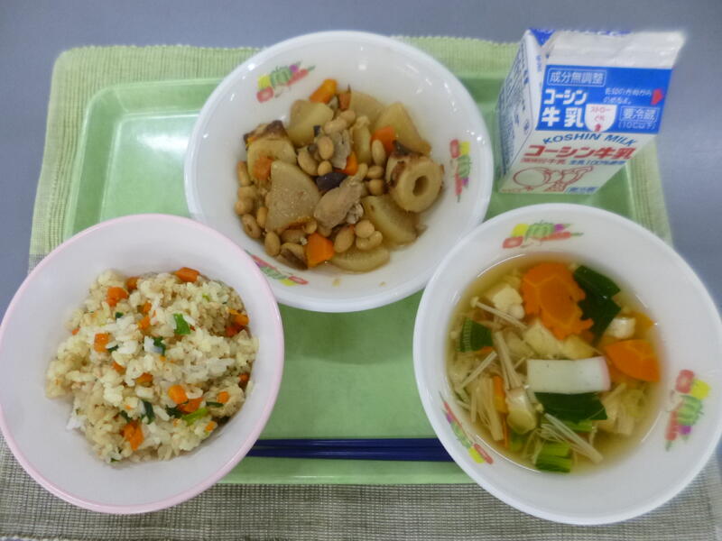 牛乳 にんじん飯 大根と大豆のこっくり煮 にしもりくんのすまし汁