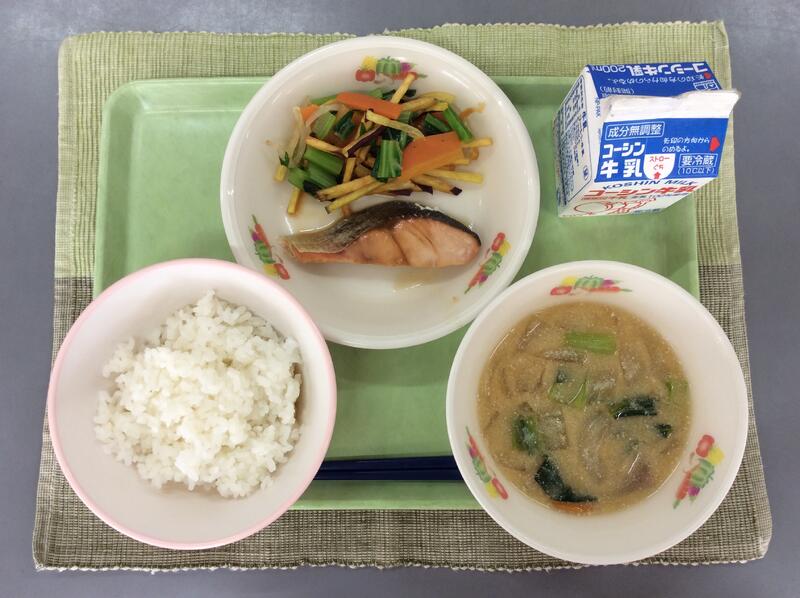 牛乳 ご飯 鮭のレモンソースがけ 小松菜のカリカリ和え 豆乳みそ汁