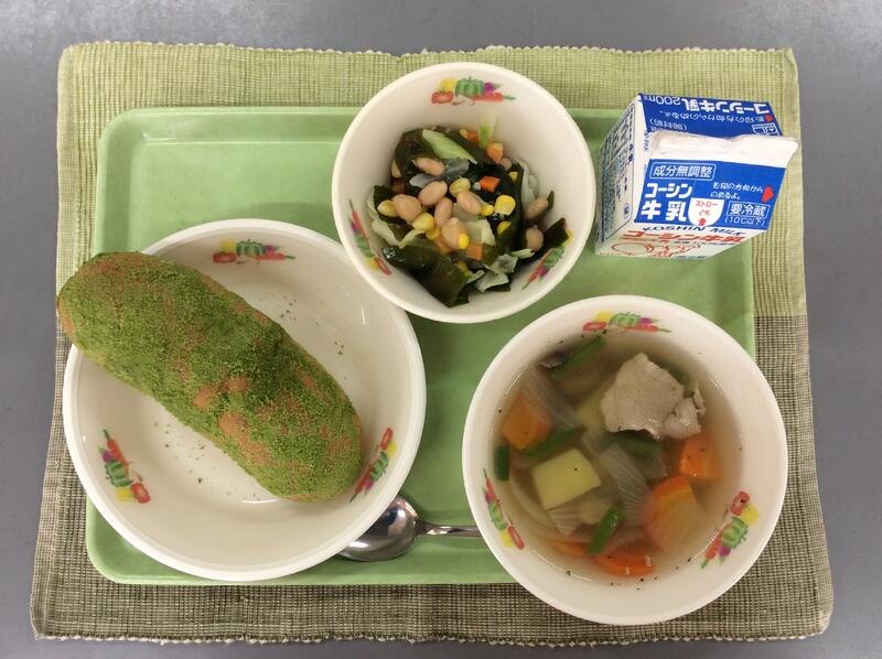 牛乳 抹茶揚げパン ビーンズサラダ ポテトスープ