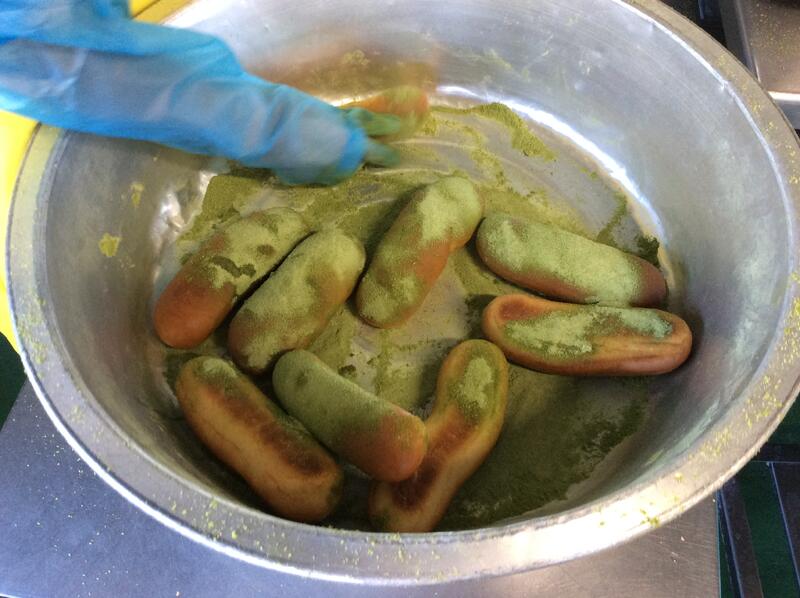 静岡県産の抹茶をスキムミルクや砂糖、塩と混ぜて揚げたコッペパンにまぶしました