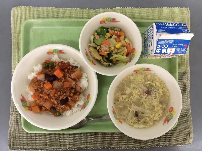 牛乳 チリコンカン丼 ツナサラダ ふわふわたまごのコンソメスープ