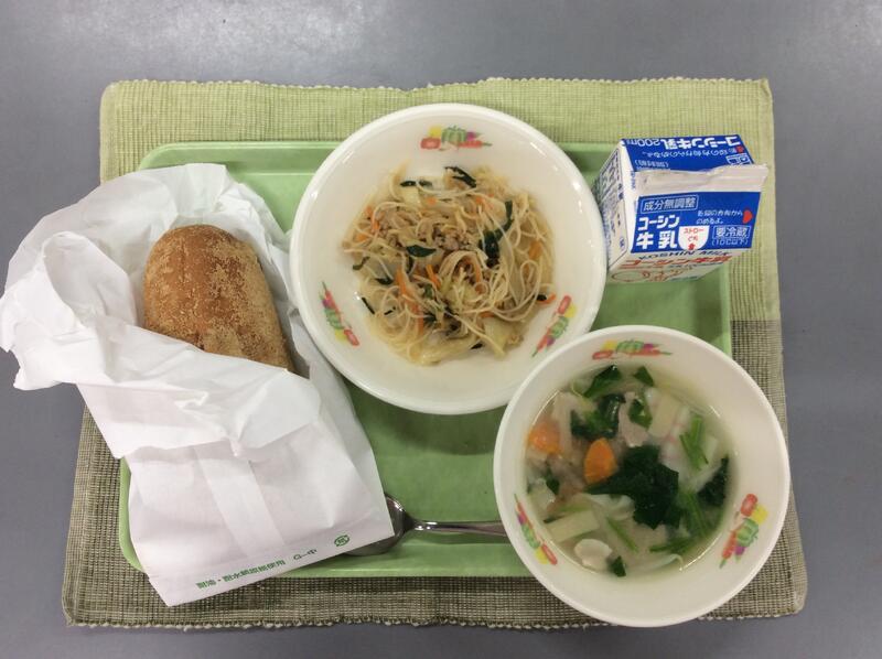 牛乳 ごまきなこあげパン 焼きビーフン ワンタンスープ