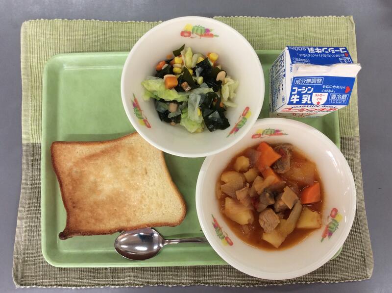 牛乳 バニラトースト じゃがいもと豚肉のトマト煮 ビーンズサラダ