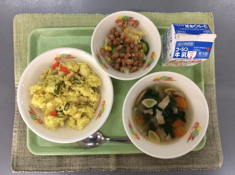 牛乳 パエリア 大豆の揚げサラダ オニオンスープ