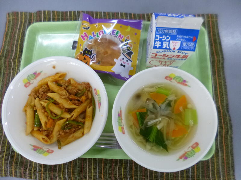 牛乳 ペンネアラビアータ 野菜ときのこのスープ パンプキンマフィン