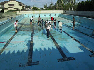6月3日(月)金曜日の清掃に続いて、6年生がプールサイドやシャワー室、トイレなどの清掃を行いました。