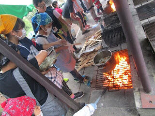 2日目 午前中に野外判事として豚汁づくりを行い、お昼にご飯と一緒に食べました。