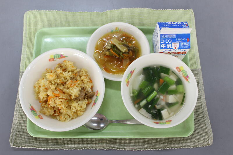 牛乳 キムチチャーハン 揚げ魚の野菜あんかけ 青ネギのスープ