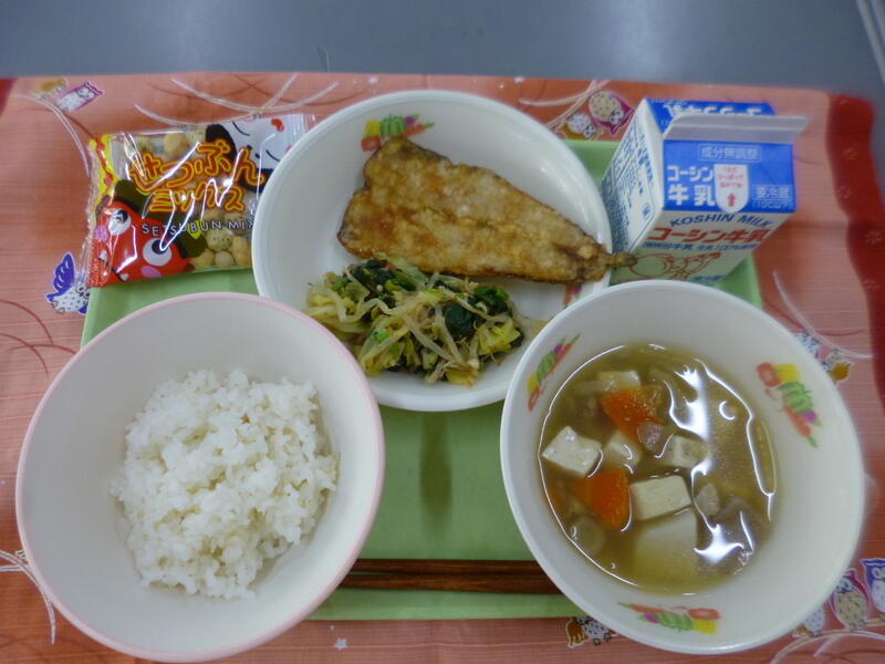 牛乳 ごはん いわしのかば焼き ほうれん草のお浸し けんちん汁 福豆
