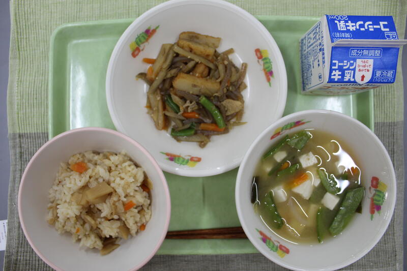 今日は春らしい食材をたくさん使ったメニューです。鹿児島県で収穫された生のたけのこをたっぷり入れて、たけのこごはんを作りました。春にしか食べることのできない料理のひとつです。