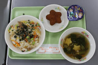 今日の給食のそうめんは「魚めん」といって、魚が練り込まれたものでした。その他にも星をあしらったもの(ちらし寿司の海苔、コロッケ、七夕汁のおくらとかまぼこ)がたくさん入っていました。