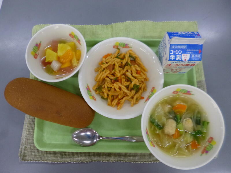 牛乳 サフランライスのクリームソースがけ ミネストローネ ひとくちゼリー(ぶどう)