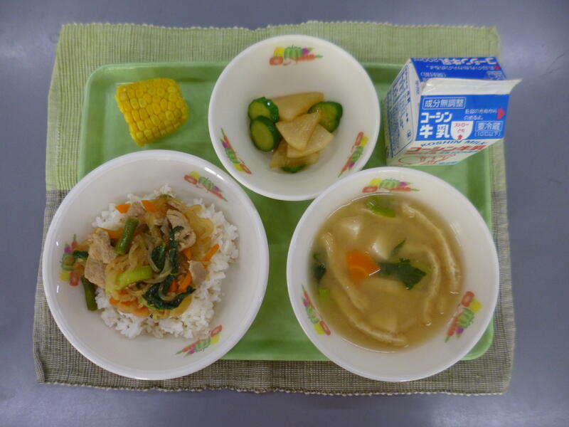 牛乳 豚丼 ピリ辛きゅうり(大根入り) 豆腐と油揚げの味噌汁 茹でもろこし
