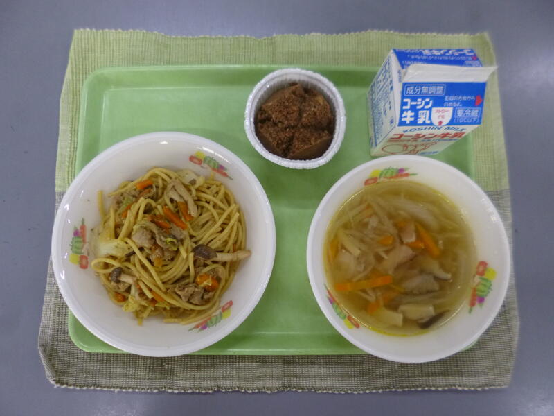牛乳 塩昆布パスタ 切り干し大根の洋風スープ ココア蒸しパン