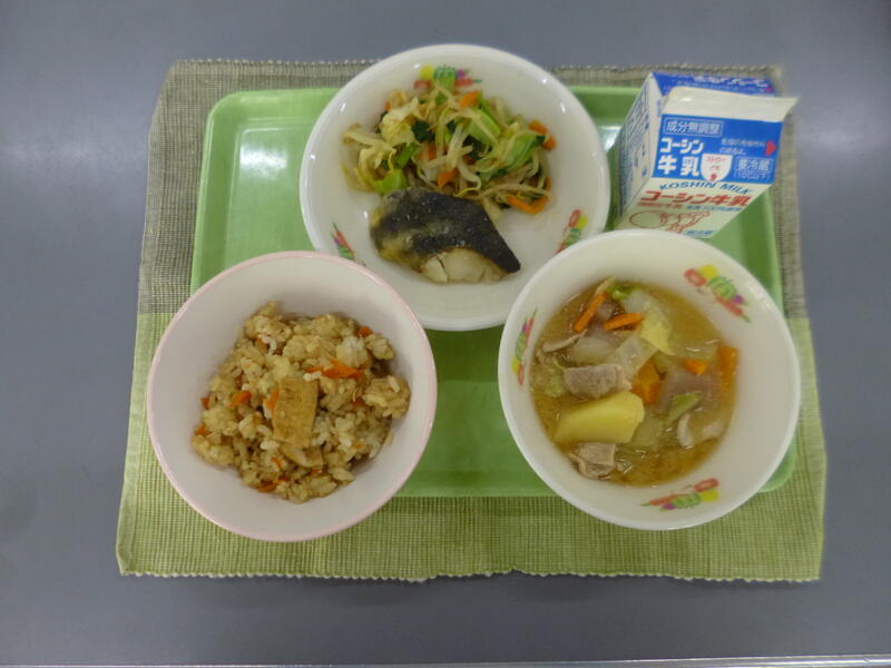 牛乳 こぎつねごはん ホッケの塩焼き おかか和え 豆乳味噌汁