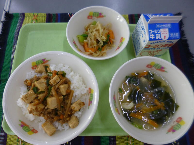 牛乳 マーボー豆腐丼 三色ナムル 春雨スープ