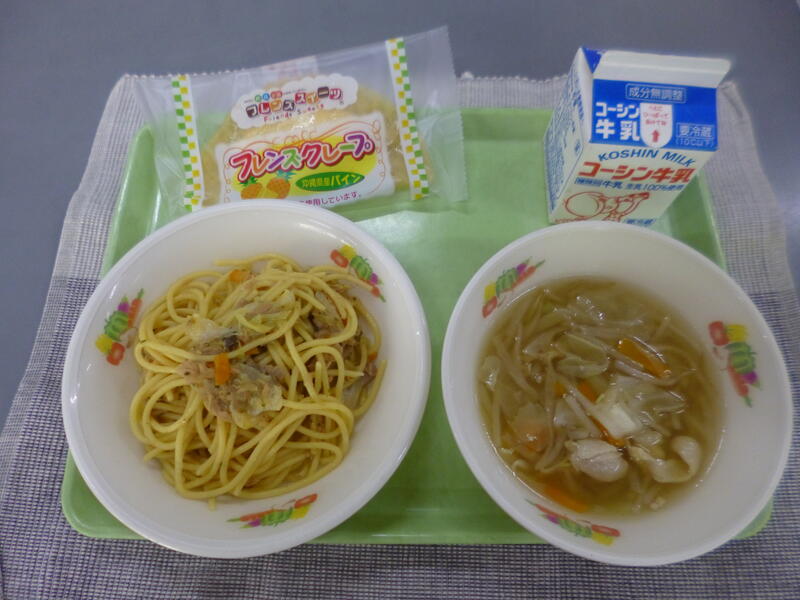 牛乳 ツナの和風スパゲティ 鶏野菜スープ パインクレープ