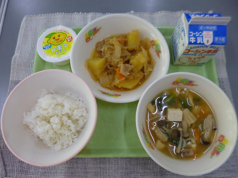 牛乳 ごはん 韓国風肉じゃが きのこ汁 はちみつレモンゼリー