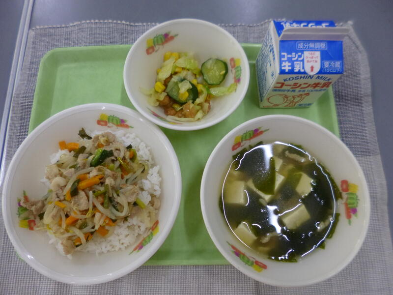 牛乳 ねぎ塩豚丼 揚げ大豆のサラダ わかめと豆腐のスープ